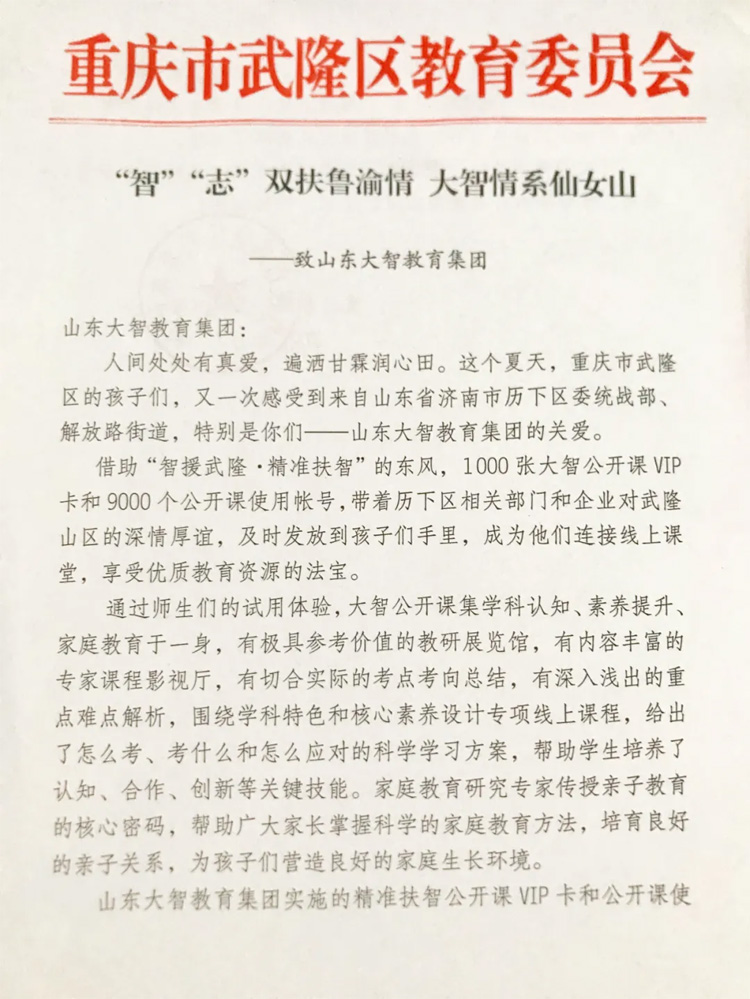 08月24日,重慶市武隆區教育委員會給大智寫來感謝信,就大智為武隆區學校公益捐贈大智公開課VIP卡表示感謝。為深入貫徹落實習近平總書記“扶貧...