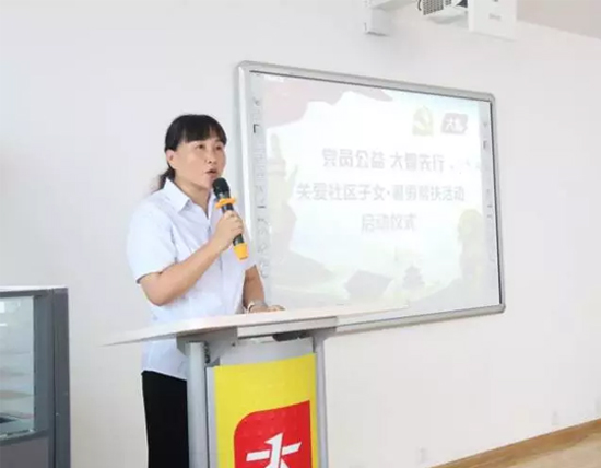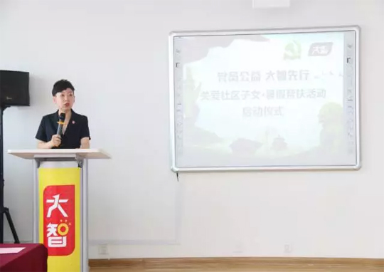 07月24日,由濟南市歷下區解放路街道黨工委聯合大智小班黨支部發起的“黨員公益 大智先行——關愛社區子女”暑假幫扶活動啟動儀式在大智控股集團總部舉行。解放路街道青龍街社區居委會副主任張蕊等領導,大智控股集團黨委委員、濟南區域總校長宋靜文,接受幫扶的社區家長和孩子以及小班黨支部代表參加了儀式。
