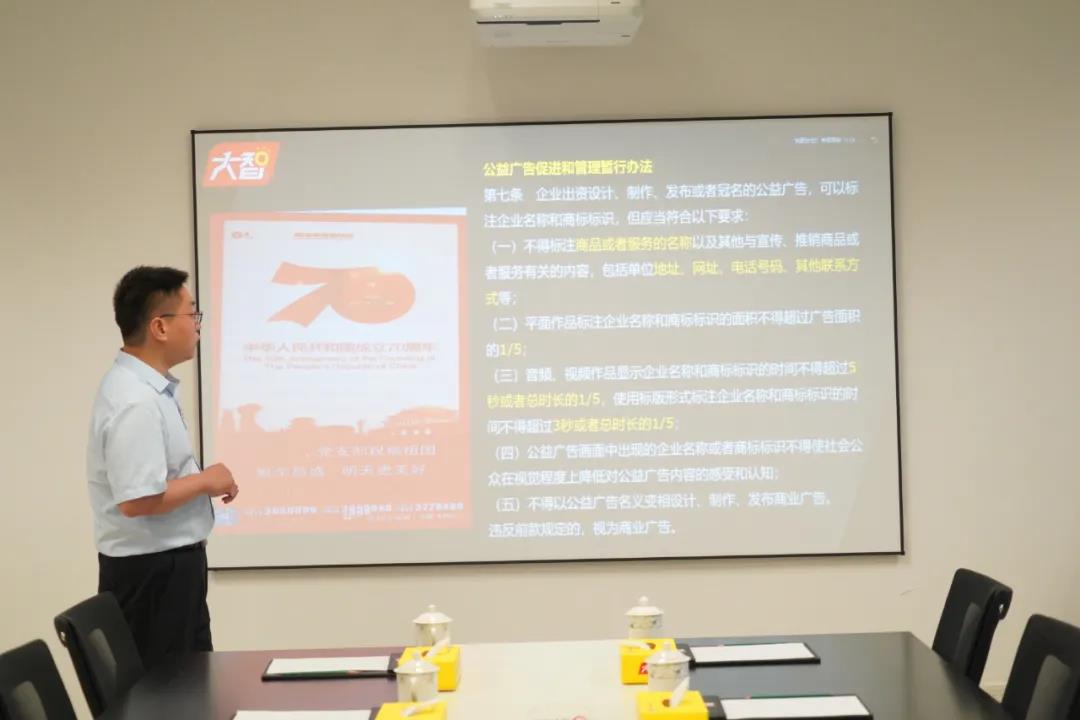 7月14日,大智教育集團黨委副書記蔡小帥為黨員干部們帶來《規范宣傳 應知必知》的內容培訓,蔡小帥從中國廣告法律體系、廣告代言人的認定、絕對化用語的范圍、虛假廣告的認定、廣告意識形態問題、教培行業宣傳規范6個方面進行詳細講解,部分黨員現場參加培訓,其他區域(公司)的黨員們通過視頻連線的方式參加培訓。通過此次學習,各位黨員家人對大智的市場宣傳規范有了更深刻的認知。