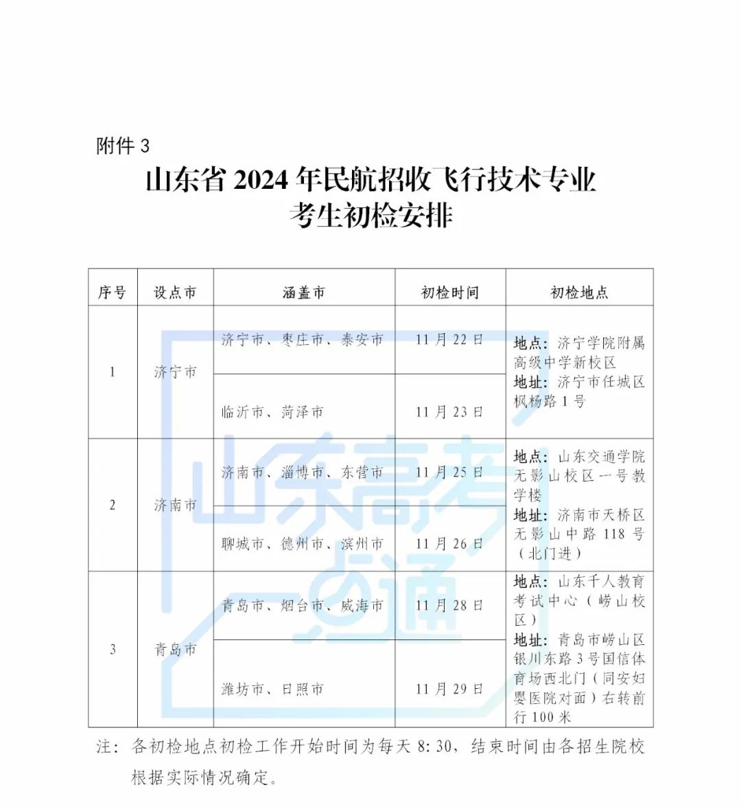 (二)初檢預選。招飛各項選拔工作由各院校具體組織實施。我省在濟南、青島、濟寧3市設立招飛初檢站,各招生院校按照規定時間在每個初檢站分別組織初檢預選工作,具體時間地點安排見附件3。考生須攜帶身份證及報考院校規定的證件材料等,按照附件3規定的時間地點到達指定初檢站,參加擬報考院校組織的民航飛行技術專業的初檢預選。
