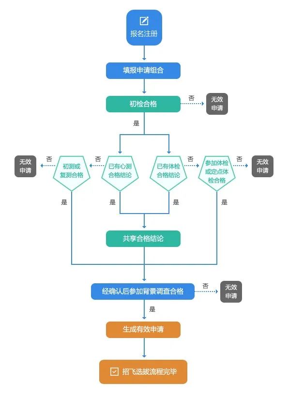 為幫助您在招飛選拔過程中節約時間和費用,便于您更好地備考,同時讓您有機會在更多的合格申請組合中選擇確認有效招飛申請,系統對部分環節的結論在特定情況下設定了結論共享。請注意,這里的結論共享特指申請組合之間共享。