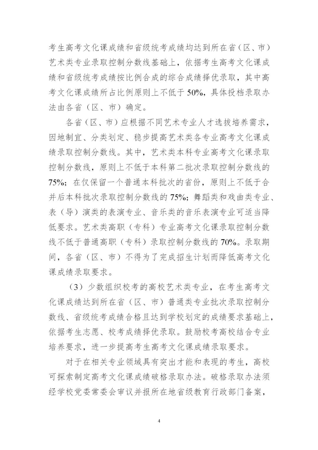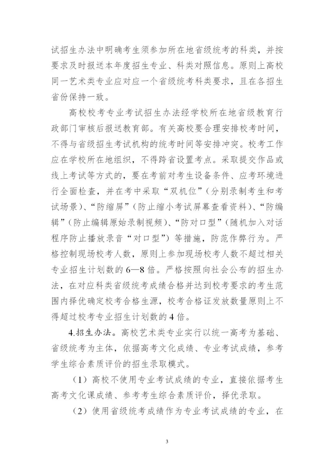 3.平穩做好藝術類考試招生。各地要認真落實藝術類專業考試招生改革部署,進一步加強省級統考能力建設,考試科類基本實現全覆蓋。要對照有關工作規范,完善省級統考科目和內容,優化考試組織和流程,推進省級統考提質增效。要科學制定藝術類專業招生錄取辦法,確保改革平穩落地。少數專業特色鮮明、人才培養質量較高的藝術院校,經省級教育行政部門批準可在省級統考基礎上組織個別專業校考。有關高校要結合人才培養定位,科學制定校考專業考試招生辦法,加強與省級統考銜接,合理確定校考形式及內容。2024年起,高校高水平藝術團不再從高校招生環節選拔,由有關高校從在校生中遴選培養。