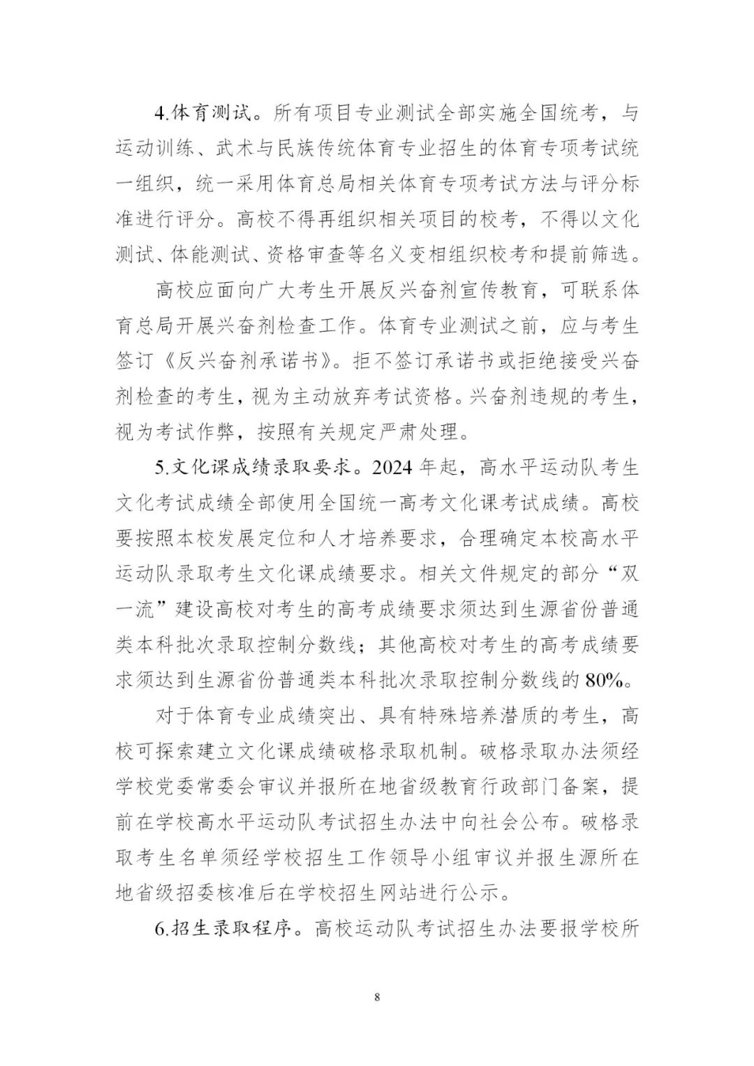 4.平穩做好高水平運動隊考試招生。有關高校要緊緊圍繞高水平運動隊工作定位,根據學校運動隊建設規劃,優化招生項目范圍。要嚴格招生程序,完善評價辦法和招生錄取機制,合理確定文化成績要求。2024年起,高水平運動隊考生文化考試成績全部使用全國統一高考文化課考試成績;專業測試全部納入全國統考,由體育總局牽頭組織實施,高校不再組織相關校考。
