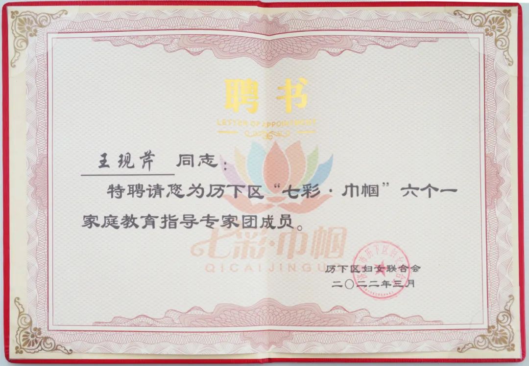 王現芹被聘為歷下區“七彩•巾幗”六個一家庭教育指導專家團成員,她表示,將堅持落實習總書記關于“注重家庭、注重家教、注重家風”的重要論述,全方位解讀家庭、家教、家風話題和家庭建設的深刻內涵,當好家庭建設的“指導員”。