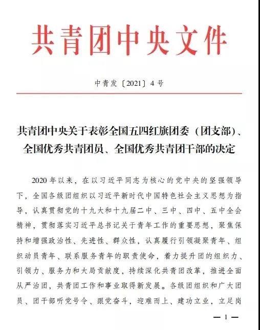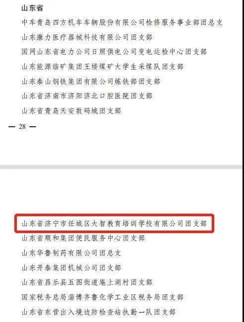 4月27日,共青團中央發布《關于表彰全國五四紅旗團委(團支部)、全國優秀共青團員、全國優秀共青團干部的決定》,山東省濟寧市任城區大智教育培訓學校有限公司團支部榮獲2020年度“全國五四紅旗團支部”榮譽稱號,這是共青團中央授予全國基層團組織的最高榮譽。