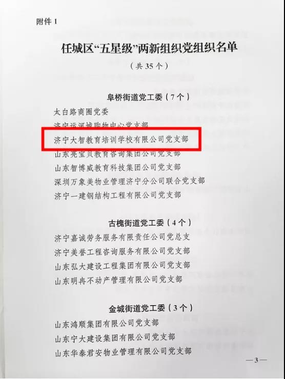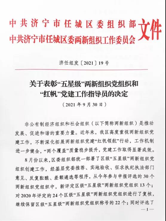 近日,中共濟寧市任城區委組織部、中共濟寧市任城區委兩新組織工作委員會發布《關于表彰“五星級”兩新組織黨組織和“紅帆”黨建工作指導員的決定》(濟任組發〔2021〕19號)有關規定,大智濟寧區域黨支部榮獲任城區“五星級”黨組織稱號!