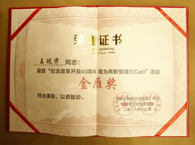 在此前《非公有制企業黨建》雜志社組織的“紀念改革開放40周年,我為兩新黨建打call”大型視頻展播活動中,來自全國的300余名兩新黨組織書記參與到活動中,王現芹的先進事跡視頻脫穎而出,成為全國40名“紀念改革開放40周年 我為兩新黨建打CALL”金雁獎獲獎者之一。