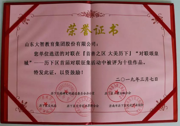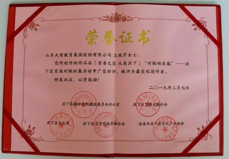 03月07日,『首善之區 大美歷下』“對聯頌泉城”——歷下區首屆對聯征集評選活動頒獎典禮在濟南市歷下區歷下大廈舉行。大智控股集團黨委書記王現芹作為獲獎者受邀參加典禮。