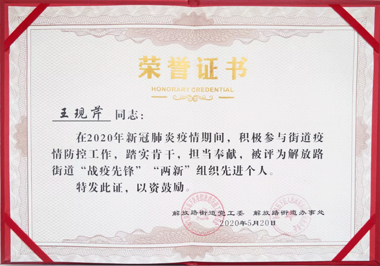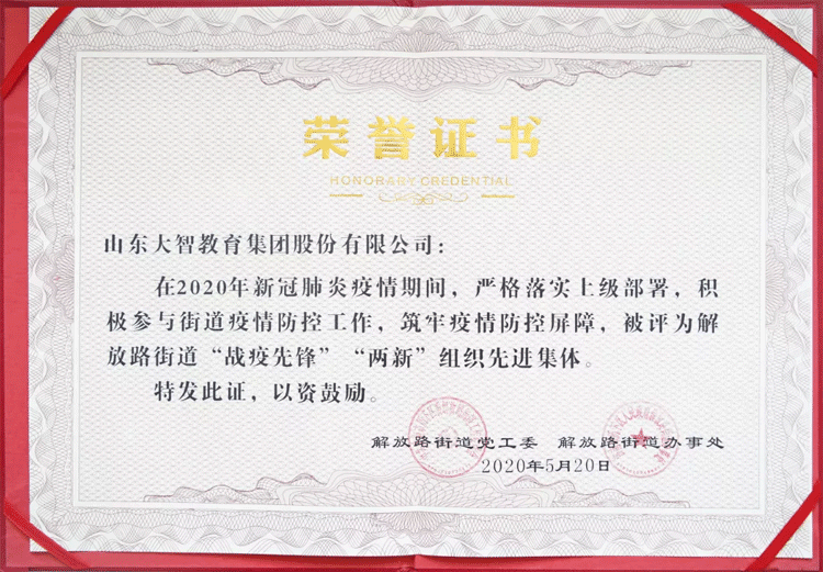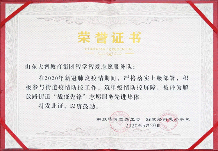 05月20日,由濟(jì)南市歷下區(qū)解放路街道黨工委和街道辦事處主辦,大智控股集團(tuán)承辦的解放路街道“戰(zhàn)疫先鋒”表彰活動在歷下區(qū)文化和旅游局舉辦,現(xiàn)場對解放路街道新冠肺炎疫情期間涌現(xiàn)出來的先進(jìn)黨組織、先進(jìn)集體和先進(jìn)個人進(jìn)行表彰。濟(jì)南市歷下區(qū)委常委、宣傳部部長王海清,副區(qū)長趙琳,區(qū)委組織部副部長、區(qū)公務(wù)員局局長王軍凱,解放路街道黨工委書記仵愛之等參會。會上,大智榮獲“‘戰(zhàn)役先鋒’‘兩新’組織”先進(jìn)單位、“‘戰(zhàn)役先鋒’‘兩新’組織”先進(jìn)個人、“‘戰(zhàn)役先鋒’志愿服務(wù)先進(jìn)集體”等系列榮譽(yù)。