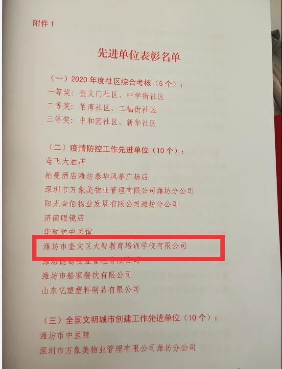 2020年新冠肺炎疫情爆發以來,大智教育集團黨委積極響應疫情防控要求,扎實開展各項疫情防控措施,近日,大智濰坊區域獲得“疫情防控工作先進單位”榮譽稱號。