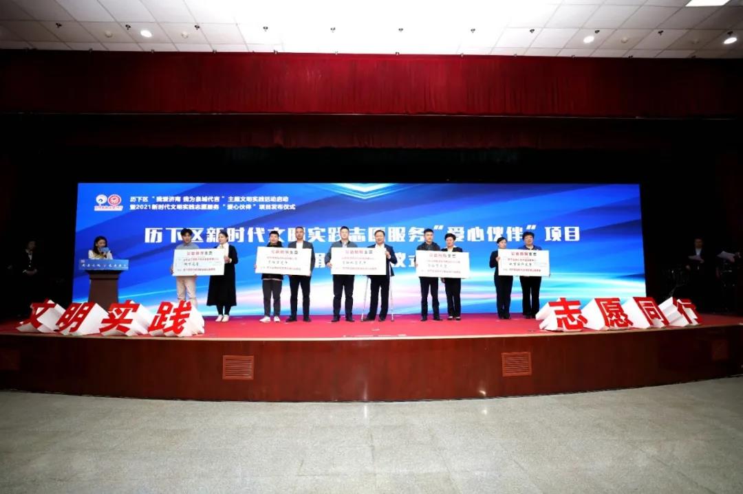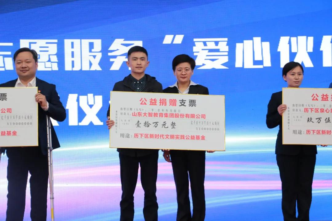 愛心伙伴項目捐助認領儀式上,山東大智教育集團股份有限公司等五組愛心伙伴企業負責人為志愿服務團隊代表進行捐贈。其中大智教育集團為歷下區新時代文明實踐公益基金捐贈10萬元。