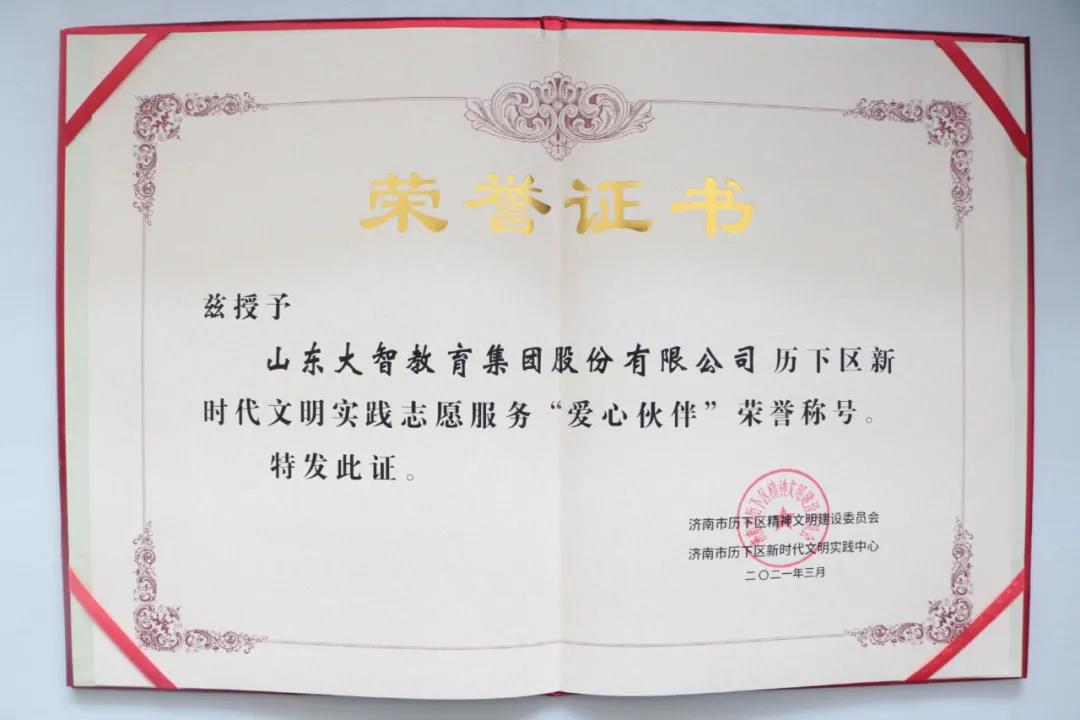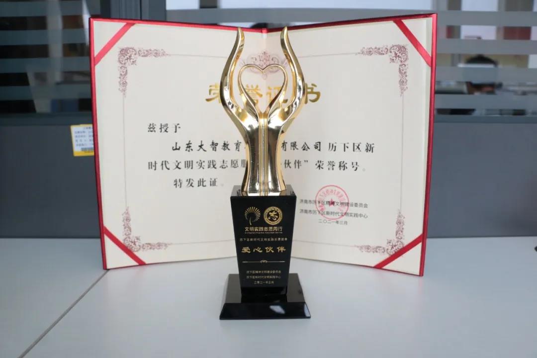 濟南市歷下區精神建設委員會和濟南市歷下區新時代文明實踐中心授予山東大智教育集團有限公司歷下區新時代文明實踐志愿服務“愛心伙伴”稱號,并授予了榮譽獎杯及證書。