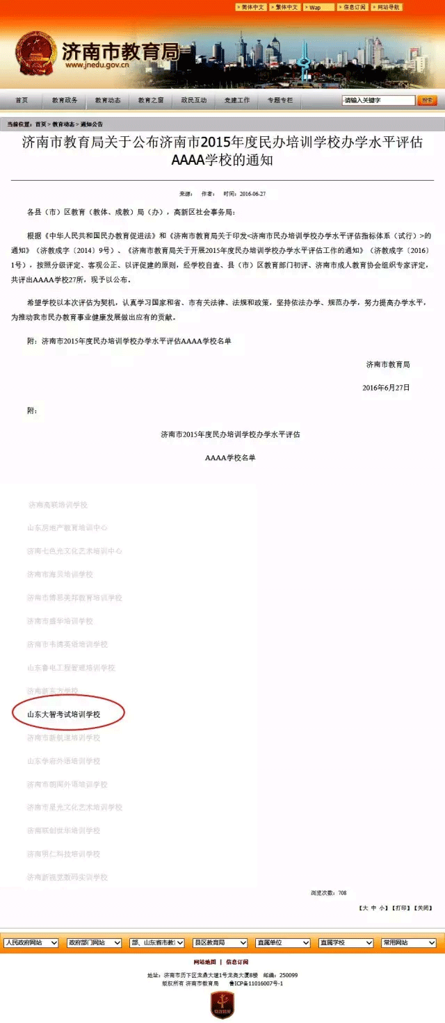 大智被評為濟南市2015年度AAAA級民辦培訓學校