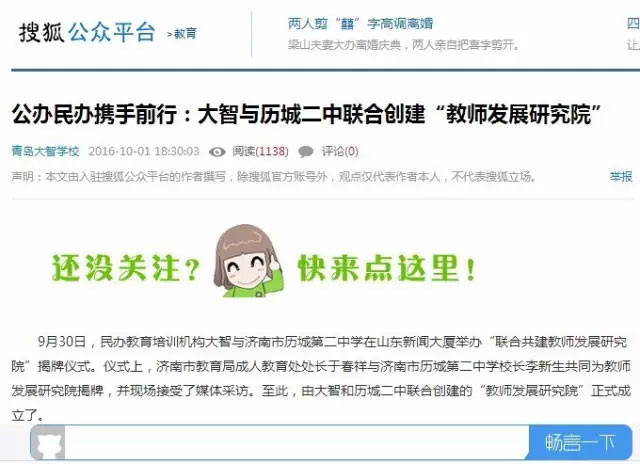 作為民辦教育與公辦學校攜手合作的重大突破性事件,此次“教師發展研究院”的成立受到了業內大v的紛紛點贊。蜜蜂網、智來智庫、教育大咖等微信大v公眾號更是專門就此事撰稿、發文,為此次“壯舉”送上祝福。