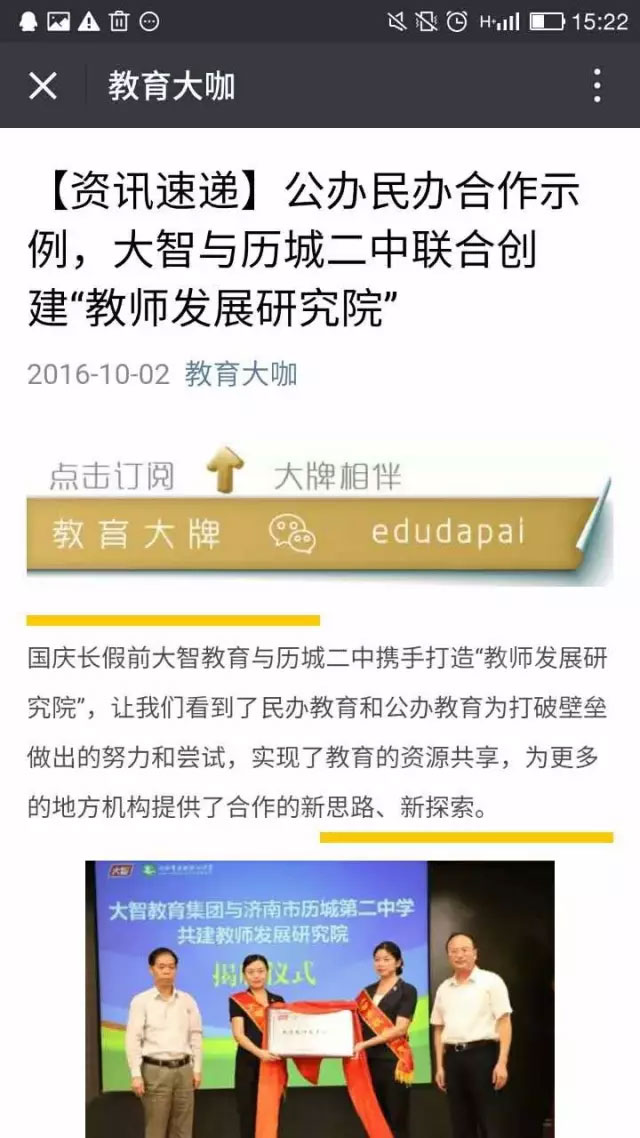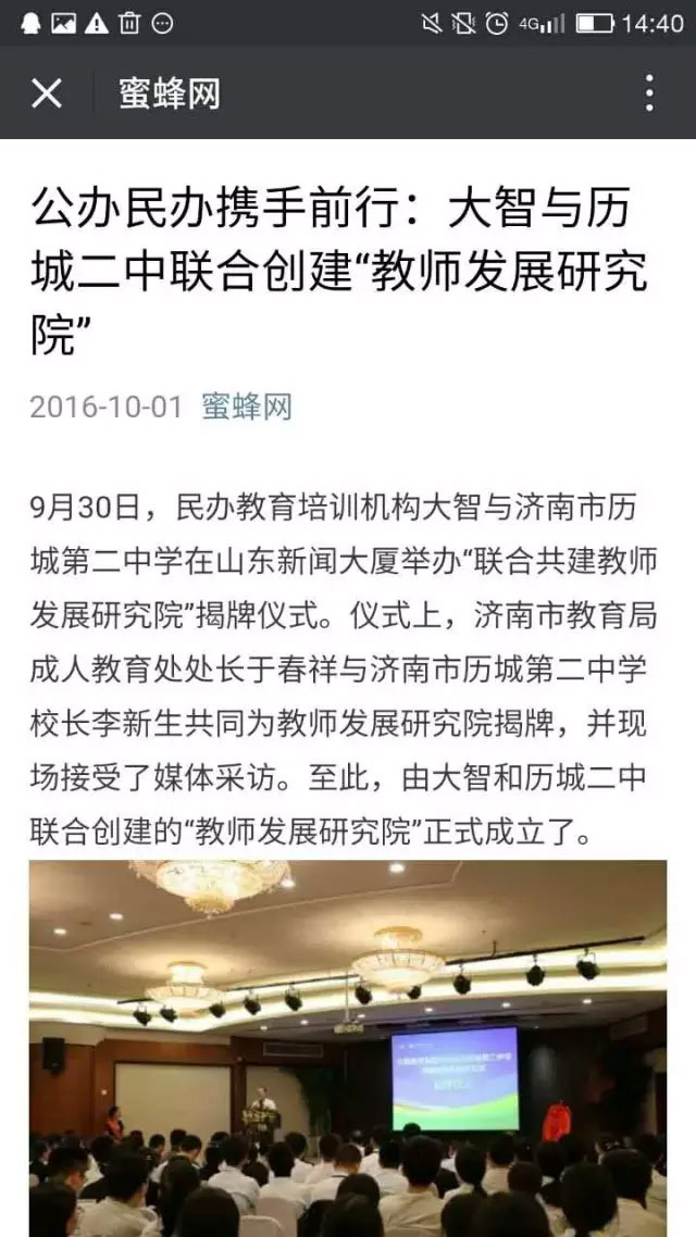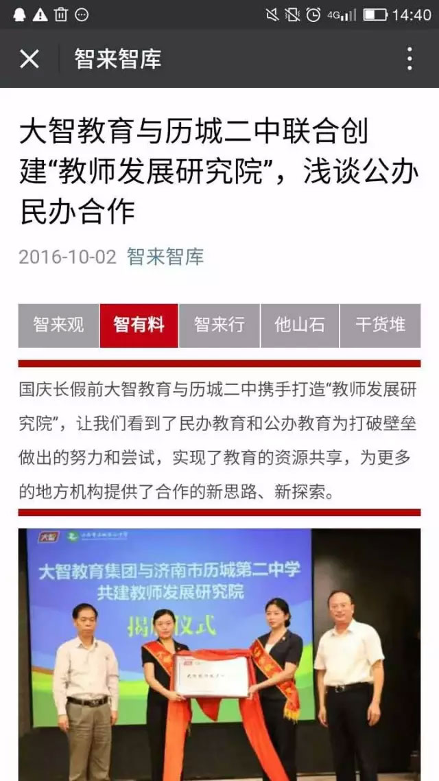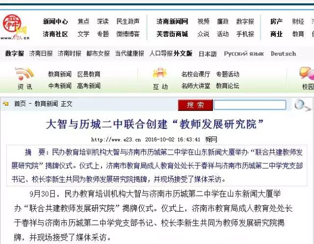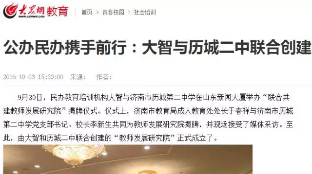10月01日,《生活日報》08版,發文指出,大智與歷城二中合建“教師發展研究院”開創了民辦教育與公辦教育合作新模式,為教育培訓機構探索出新路子,是教育改革的重大突破。