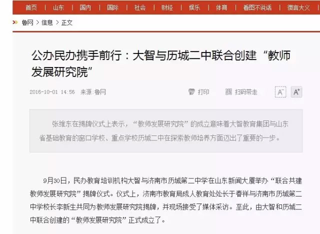 來自齊魯網的第一時間報道稱,大智“為民辦教育和公辦教育之間打破壁壘,實現教育資源共享、優勢互補、協同發展提供了新思路、新探索。”
