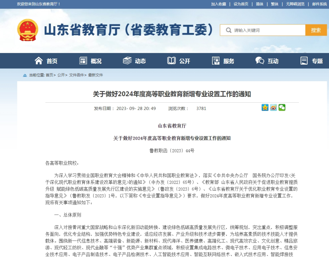 近日,山東省教育廳印發《關于做好2024年度高等職業教育新增專業設置工作的通知》。