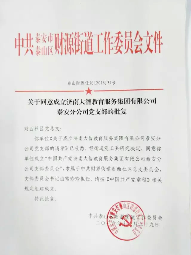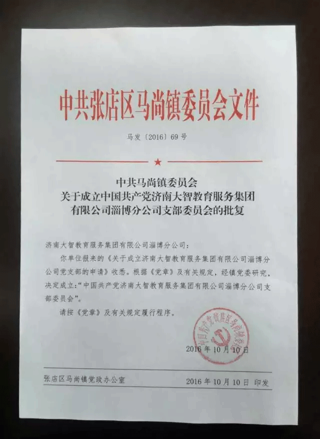 2016年10月10日,中共張店區(qū)馬尚鎮(zhèn)委員會正式批復(fù)同意成立中共濟(jì)南大智教育服務(wù)集團(tuán)有限公司淄博分公司支部委員會。這是大智教育集團(tuán)繼臨沂分...