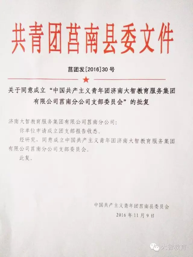 11月09日,中國共產主義青年團莒南縣委員會正式批復同意成立“中國共產主義青年團濟南大智教育服務集團有限公司莒南分公司支部委員會”。莒南分公司團支部是繼淄博、臨沂之后,大智成立的第三個區域團支部,將對大智今后的發展及各項工作的開展產生積極推動作用。
