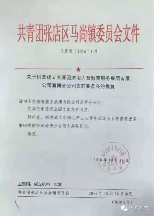 繼2016年10月10日大智淄博分公司黨支部成立之后,10月16日,共青團張店區馬尚鎮委員會正式批復同意成立共青團濟南大智教育服務集團有限公...