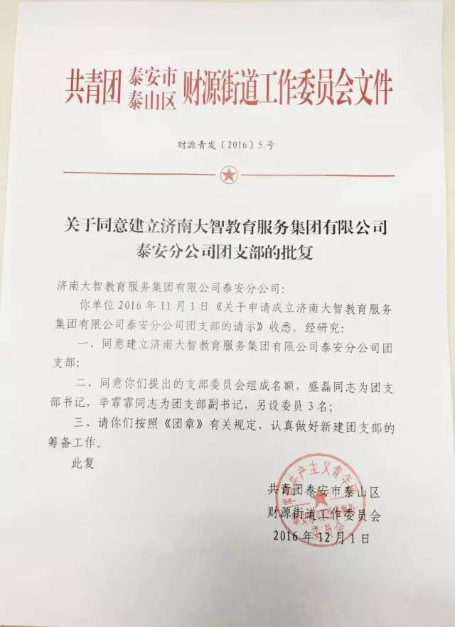 12月01日,共青團泰安市泰山區財源街道工作委員會正式批復同意成立濟南大智控股服務集團有限公司泰安分公司團支部,標志著繼淄博、臨沂、莒南、濰...