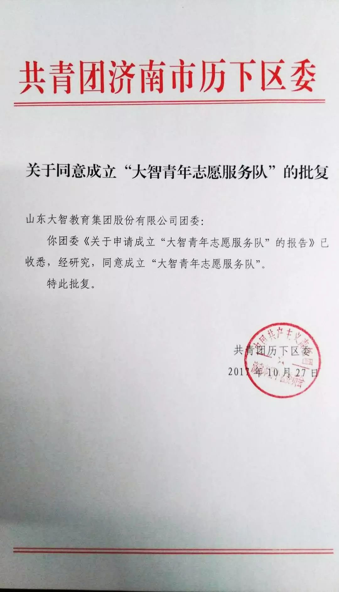為了建立長期有效的機制,更好地開展公益事業,肩負起社會責任, 10月27日,大智青年志愿服務隊獲批復正式成立!共青團歷下區委同意成立大智青年...
