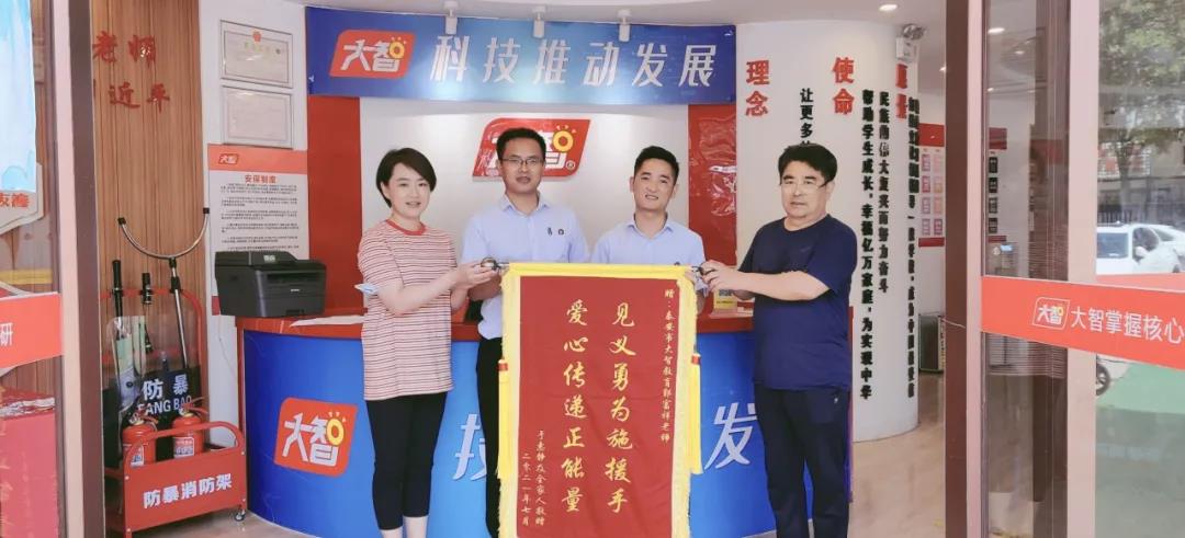 7月14日,一對父女來到泰安大智,將印有見義勇為施援手、愛心傳遞正能量的錦旗送到大智高中政治學科導師郭富祥手中,感謝他不顧自身安危,